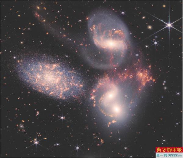 在斯蒂芬五重星系(Stephan‘s Quintet)图中,韦伯望远镜还透露了前所未见的细节。这是一个由五个星系组成的星系团,距离地球2.9亿光年,早在1877年就被发现,其中四个经历反复近距离接触的星系存在显著的引力相互作用,它们被锁定在“天体舞蹈”中。这为人类提供了对早期星系在宇宙开始时是如何形成的洞察机会。