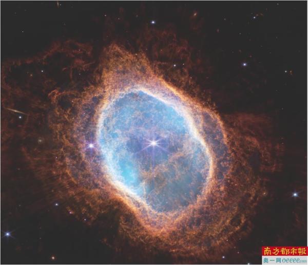 在南环星云(Southern Ring Nebula)图中,显示其中心的一颗昏暗的恒星首次被发现覆盖尘埃,它在临终前喷出气体和尘埃环。