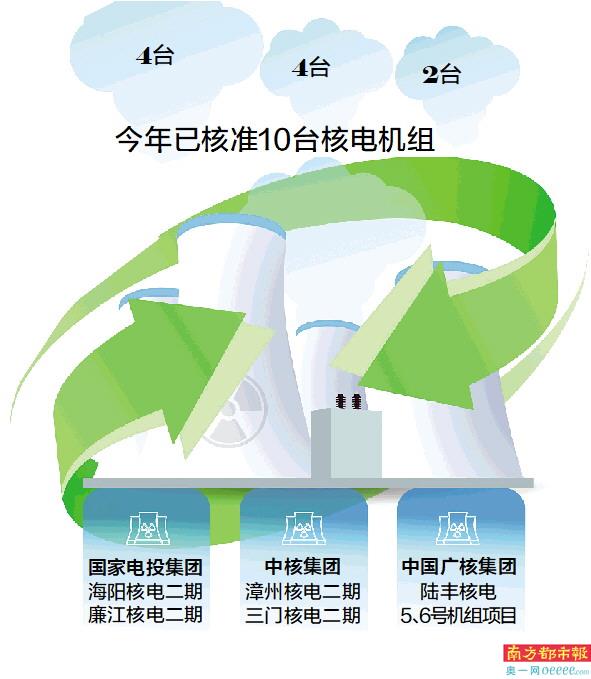 9月13日召开的国务院常务会议指出,为提升能源保障能力和促进绿色发展,会议决定,核准已列入规划、条件成熟的福建漳州二期、广东廉江一期核电项目。这已不是今年首次核准核电项目。今年4月20日召开的国务院常务会议就曾核准浙江三门、山东海阳、广东陆丰三个核电项目,加上此次核准的漳州二期以及廉江一期,今年核准的核电项目已达5个,共计10台机组。
