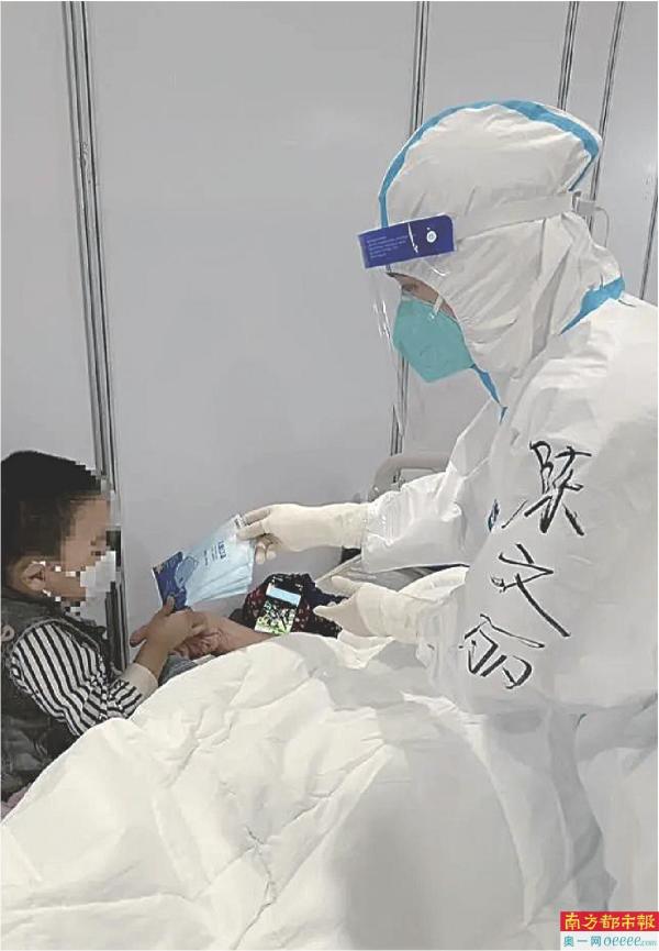 广州市第一人民医院琶洲方舱舱内护理组组长陈文丽照看小男孩。