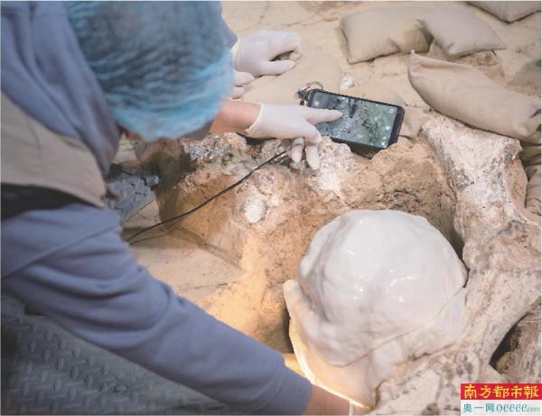 为了确保提取工作万无一失,不对化石和周边遗存造成破坏,考古队周密计划、精心组织,依托先进的实验室考古和科技手段支撑,精耕细作,逐步将化石从坚硬的原生土层中剥离。发掘过程中,还为化石量身定制了硅橡胶外套进行保护,并使用了内窥镜、风刻笔等精细化考古装备,让整个提取工作如手术般精准。