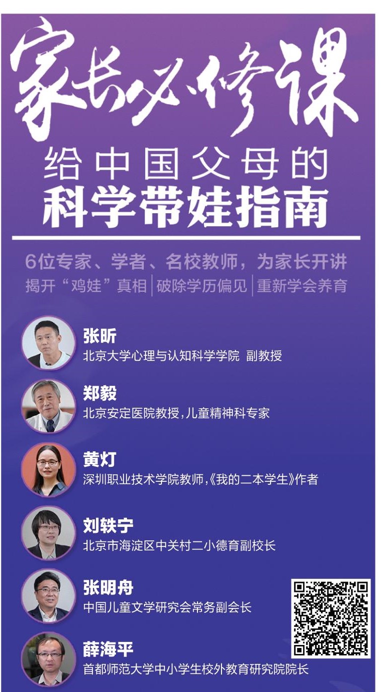 北京大学心理与认知科学学院副教授张昕有着教师和家长的双重身份,他将向大家分享自己的育儿之道,介绍教育中如何保护孩子的好奇心和内驱力。北京安定医院教授、儿童精神科专家郑毅直言,“鸡娃”无异于一种心理虐待,他在工作中发现,在学前阶段,家长强迫儿童超前学习学科知识,这些孩子长大后厌学比例更高。作家、在职校执教的黄灯长期关注非名校学生的发展和去向,她坚定地认为,学历低不代表没前途,人生有很多次重新出发的机会,“赢在起跑线”只是一句毒鸡汤。北京中关村二小德育副校长刘轶宁则将向家长传授实现高质量家校沟通的实用方法。中国儿童文学研究会常务副会长张明舟将详解阅读的力量,以及家长如何帮助孩子打开阅读的兴趣窗口。首都师范大学中小学生校外教育研究院院长薛海平已经关注中国校外培训行业近二十年,在他的研究和观察中,报课外班不是越多越好,父母应尊重孩子的选择和意愿,否则会伤害孩子的心理健康。
