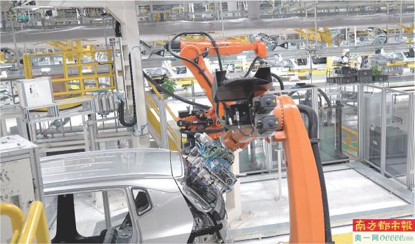 内装车间生产线上,六轴机器人正忙碌而有序地挥舞着机器臂,根据人工设定的数据,对被运送来的不完整电动车进行车身扫描、前后挡玻璃涂胶和搭载。