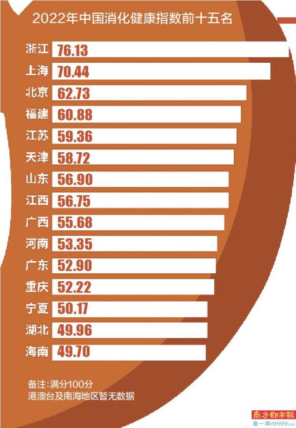 指数结果显示,长三角地区消化健康指数最高,前五名中占据三席。