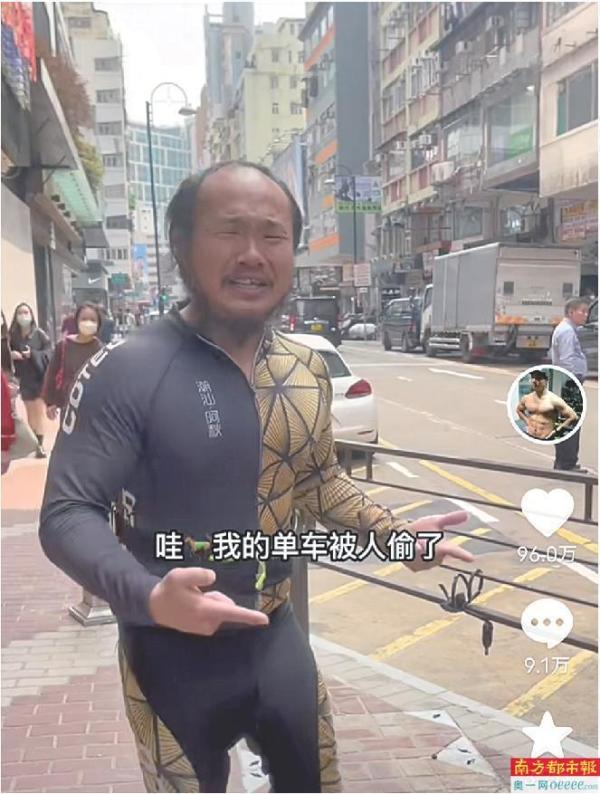 不过,在3月9日的视频里,他没心情讲这个开场白了。他一上来就急得把两手一拍:“我的单车被人偷了!”他说,自己在香港旺角,前一天晚上把单车锁在路边的栏杆上,没想到第二天一早发现锁被人剪开,单车不见了。