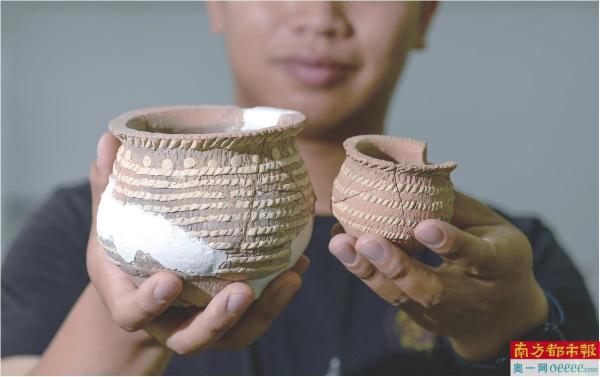 3. 考古工作人员展示南佐新石器时代遗址内出土的箍白泥附加堆纹夹砂陶罐。