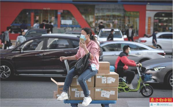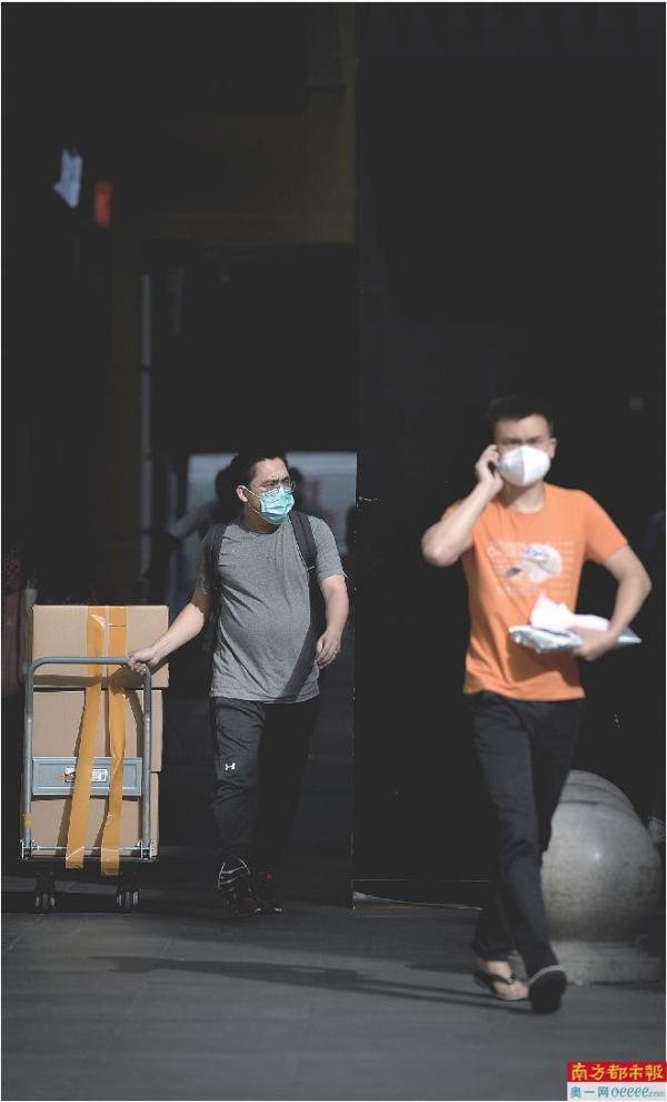 在深圳华强北街头,人们戴着口罩搬运货物。新华社发(资料图)