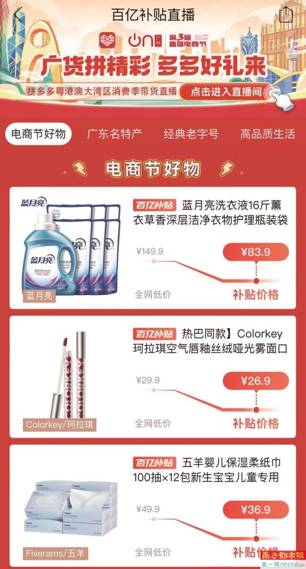 直播电商节活动期间,拼多多活动专区也于4月25日在客户端同步上线,针对化妆品、食品、洗护用品、服饰、家电等广东地区的优势产品及品牌,开启为期20天的补贴让利活动。消费者打开拼多多App,搜索“电商节直播”便可一键直达。
