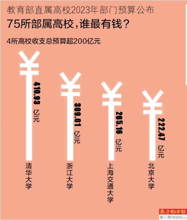 据中国教育在线报道,对比2022年度部门预算,绝大部分教育部直属高校2023年度预算总经费有很大幅度上涨。今年教育部直属高校中,有20所高校的部门预算超过百亿元,相比去年增加了5所。