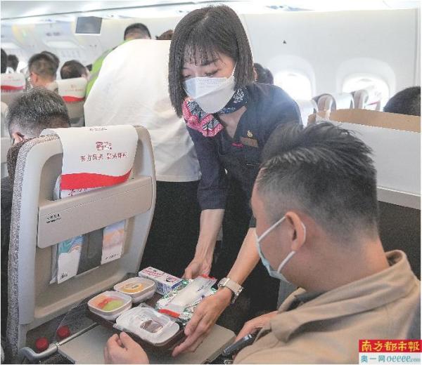 本次航班上,由旅客投票选出的主题餐食亮相。其中,经济舱的这款餐食叫“五福临门”,主食是腊味煲仔饭,搭配三色水果拼盘、C919首航特色芒果布丁,还有巧克力酥饼、牛奶。