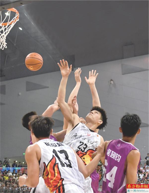 6月18日,广东工业大学队球员陈国豪(中)在比赛中拼抢。当日,在成都举行的第25届中国大学生篮球联赛(CUBAL)男子组全国总决赛中,广东工业大学以87比83击败清华大学。 新华社发