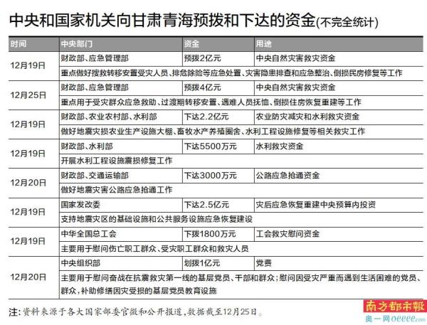 据南都记者不完全统计,地震以来,中央和国家机关、企业和社会各界以各种方式支持甘肃、青海抗震救灾和灾后重建。截至12月25日晚间,中央和国家机关预拨下达的资金,公开报道的已超14亿元。