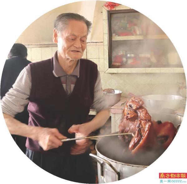 1月15日10时许,南都记者来到王伟群的猪脚饭店时,他正从锅里拿出一个个刚煮熟的猪脚,不久,店里迎来了第一位客人。王伟群熟练地将嫩滑软烂的猪脚放在案板上,拆骨、把肉切成小块,米饭淋上卤汁,秘制红蒜头紧接着被码在油亮的猪脚上……