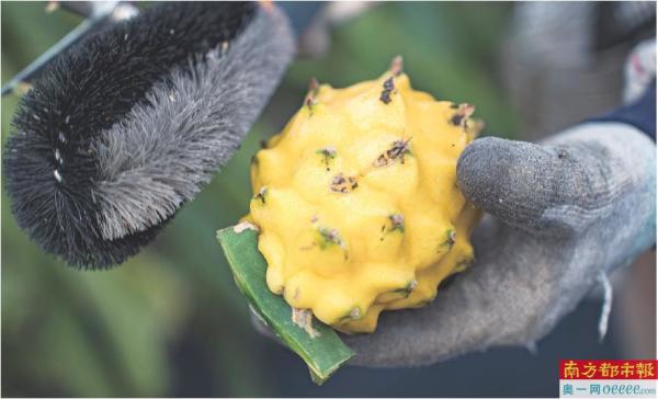 果农在采摘前先用毛刷刷掉果实上的细刺。