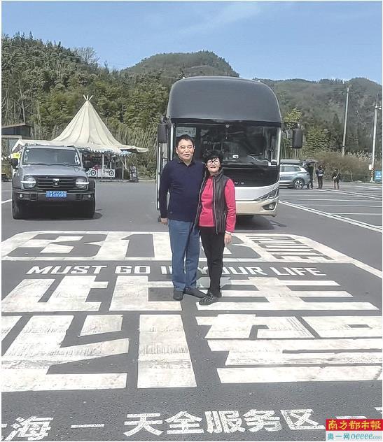 从临沂坐大巴前往拉萨,梁女士和爱人在大巴前合影。