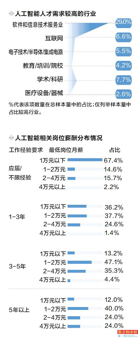 知名咨询公司麦肯锡一份关于人工智能的报告显示,预计2030年中国对AI专业人员的需求将增至2022年的6倍,人才缺口达到400万人。南都根据采集数据梳理,分行业来看,软件和信息技术服务业、互联网、电子技术/半导体/集成电路、教育/培训/院校、学术/科研、医疗设备/器械对人工智能人才的需求偏高。