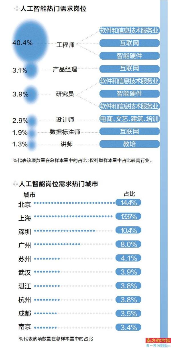 具体到典型岗位,工程师类占比最高,超过40%,主要覆盖软件和信息技术服务业、智能硬件、互联网等;其次是研究员、产品经理岗位,分别占比为3.9%、3.1%,以软件和信息技术服务业、互联网、智能硬件行业居多;此外,还有设计师、标注师、讲师等岗位,多以电商、文艺、建筑、互联网、教培等行业需求为主。