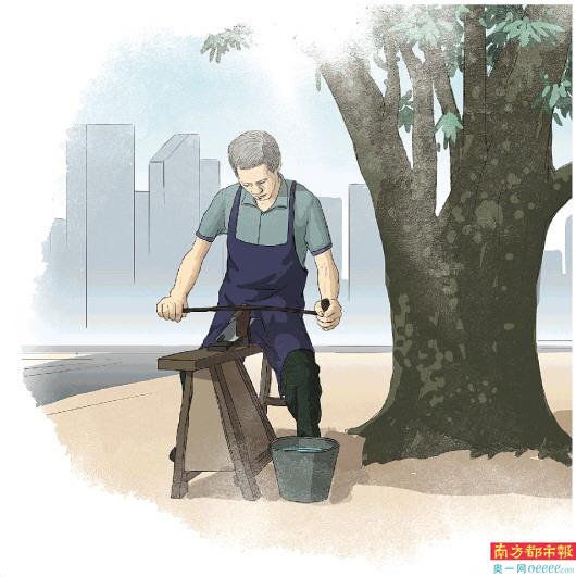 那毫不起眼的简陋摊子,位于一棵亭亭如盖的大榕树下。在充满现代气息的住宅小区里,他那灰不溜秋的围裙,历经岁月洗礼的古老行当,在夕阳的辉映下,是那么另类。