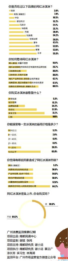 从调查结果来看,消费者对网红冰淇淋并不怎么买单。南都7月8日发起网络调查,了解消费者对网红冰淇淋的接受度。结果显示,69.2%的受访者明确表示自己不会购买网红冰淇淋。但超八成受访者表示吃过网红冰淇淋,其中吃过五羊牌的受访者占55.3%,各有52.6%的受访网友表示自己吃过雀巢和伊利,其次是蒙牛、哈根达斯,分别占比47.4%、39.5%。