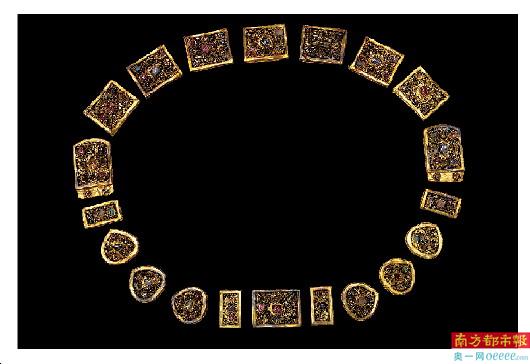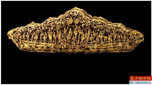 众多展品之中,有一件“金仙宫夜游分心”的金器发饰,工艺之精巧让人叹为观止。该发饰整体呈山峰形,中部有两柱葡萄,高柯拥接,抱成圆框,一人骑马穿行其间,马前有提灯开路者,有吹笙、起舞者,马后有举扇侍奉者,且圆框左右各有随从十五人,或持扇,或击鼓,或操琴,或弹琵琶,或托物品相随。行列下方为一道栏杆,栏杆下方为朵朵流云,背景为宫殿楼阁,周边均环绕连珠纹。其上有人物四十个,皆是立雕或高浮雕,玲珑剔透,层次分明,给人以纵深的立体感。背面以金箔模压出房屋及四个横置的管状穿孔。