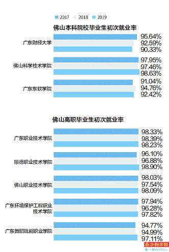 南都记者整理了2017-2019年佛山部分高校的初次就业率发现,除了2018年有轻微下降,近三年佛山本地本科、高职院校的初次就业率几乎整体呈上升趋势。