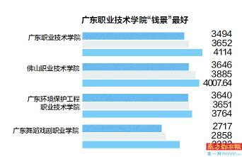 高职院校的毕业生平均起薪也在稳步提升中。根据4所学校已公布的平均薪酬数据,广东职业技术学院、佛山职业技术学院、广东环境保护工程职业技术学院和广东舞蹈戏剧职业学院几所院校均有所突破。2019年,广东职业技术学院和佛山职业技术学院2所院校从2017年和2018年的“3”字头薪酬水平,正式迈进“4”字头梯队中来。其中,广东职业技术学院的毕业生平均起薪为4114元,在全市同类院校中的“钱景”最好。广东环境保护工程职业技术学院和广东舞蹈戏剧职业学院两所院校的毕业生薪酬水平则仍在4000元以下,但与2017年和2018年相比均有提升,广东舞蹈戏剧职业学院更是在2019年首次破“3”。