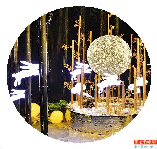 现场可以看到,大厦一楼的外围,设计有“竹报平安 节节高”的艺术装置,设计者分享,平安喜乐是人们最大的祈愿,外围繁星闪烁的烟花灯海,包围着林中之竹,在繁华的中轴线上吸引了不少路人驻足拍照留念。写字楼一楼外围的玻璃幕墙上还粘贴了金色平安竹,穿过西门映入眼帘的便是玉兔在祥云上飞跃,奔向一轮圆月,对未来寄予美好祝愿。