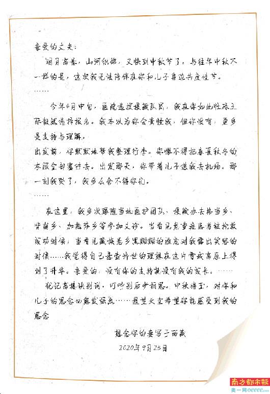 “高原见证真情,奉献诠释大爱。半年援藏经历尤如一朵盛开的格桑花,镌刻在我记忆的深处,永远点亮着我生命的旅程。在这短暂的半年中,有付出,也有收获;有汗水,也有欢笑;有遗憾,更有成功。”中秋不能与家人团聚,苏畅写了一封家书,表达对家人的想念。