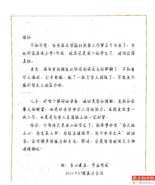 儿子,今年你已是高二的学生了,我真心希望你有“为天地立心,为生民立命,为往圣继绝学,为万世开太平”的情怀担当。我们老家的村也是扶贫点之一,去年才通水泥路。我憎恶贫穷!当国家向贫困宣战、当组织安排我去驻村扶贫时,我毫不犹豫迎接这一挑战,作为你的爸爸,我为你树立一个奋斗、担当的榜样。再说了,在脱贫攻坚一线工作的经历,也是爸爸人生道路上的一笔财富,爸爸只想为这里的村民实实在在做点实事。