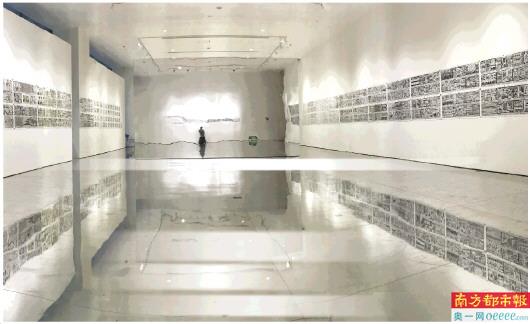 缓缓的音乐声中,走进玻璃盒子般的展厅内,地面和展厅中央的展墙上严丝合缝铺满了银白色的镜面,四面落地的墙上是阿璞历年来围绕肖斯塔科维奇、马勒和瓦格纳等古典音乐大师交响乐创作的近500张黑白画,如同一个隐秘的编码过程,阿璞透过绘画向世界阐释他对这些音乐作品和音乐家人生的解读。