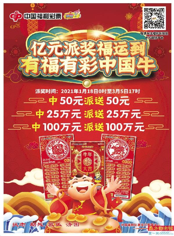 据悉,派奖活动开启之前,中国福彩中心还将启动“辛丑牛”试刮有礼预热活动。2021年1月14日至15日,彩民关注“福彩刮刮乐”微信公众号,并且完成手机号绑定,即可免费参与“辛丑牛”生肖票试刮活动,还有机会获得随机现金红包奖励。
