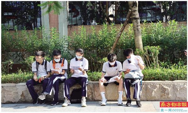 2021年广州中考,华师附中考点外,候场的考生们坐在路边复习。 南都记者 马强 摄(资料图)