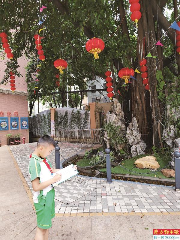 好奇特啊!更特别的是大榕树的气根,多像榕树爷爷的胡须,让他变得更加和蔼可亲,就像一个巨人守护着市桥中心小学的老师和学生。在夏天,我们可以在树下乘凉休息,它就像天然的大风扇,给我们学校带来清凉,让我们更专心上课。在秋冬,大榕树很少掉叶子,再冷也不屈不挠,它站立在风雨中,用坚强的毅力撑开一顶绿绒绒的大伞,为我们遮风挡雨。