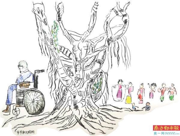 有一天,爷爷在花基坐的时候倒在了树根下,爸爸说爷爷是中风,好在斜躺在大榕树根上,头没有撞在地板,否则后果更严重。是大榕树扶了爷爷一把,爷爷说大榕树是他的守护神。不过,从此之后,爷爷再也站不起来了,只能坐在轮椅上。但他每天都要到大榕树下,静静地坐一坐。早上上学时,我和护理叔叔把他推到大榕树下,粗壮的大榕树干敞开胸襟,似乎在迎接爷爷的到来;随风轻柔飘荡的大榕树胡须,仿佛在和他招手;沙沙作响的大榕树叶,好像在和他窃窃私语。爷爷说,大榕树陪他的时间最长最长,是他最好的朋友。
