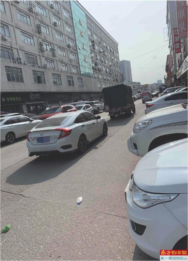 今年9月,南都记者在棠槎路走访看到,该路段长约600米,以棠槎路和怡康路交叉路口为界,位于棠槎路西侧路段,南边是一排茶叶档口,几乎每家档口门前都停放车辆,而北边亿银大厦门口围栏内设有停车场,一排机动车辆在靠近亿银大厦的路段违规停放,让原本狭窄的马路变得更窄了,勉强能容纳两车并排行驶,但体型较大的公交车、货车驶过时,只能变单车道行驶。至于行人和电动车,只能在车道上“见缝插针”地通过,或者紧贴着茶叶档口门前,在档口与停放车辆的缝隙间穿行。