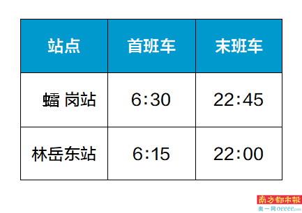 岗站首末班车发车时间分别为6:30、22:45,林岳东站首末班车发车时间分别为6:15、22:00,全天发车间隔8分钟。当遇重大活动、节假日、恶劣天气及后续的客流需要,运营单位会根据实际情况调整运营时间及发车间隔。