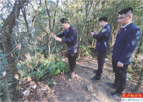 从化检察院工作人员在山道上对污染垃圾拍照取证。(资料图片)