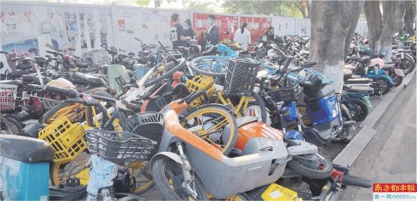 大石地铁口附近,人行道上的共享电动车、共享单车堆成小山。