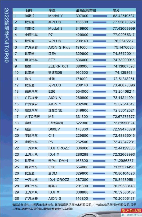 为了对一款新能源产品进行全方位的解读,南都湾财社创新性地采取“不分价格、同台竞争”的方式,并与行业数家权威机构、平台深度合作,获得海量原始数据后,再进行交叉对比,然后汇总、排行、分析、校准,最终形成这份“2022新能源汽车百强报告”,呈现目前新能源车产品竞争力全貌。