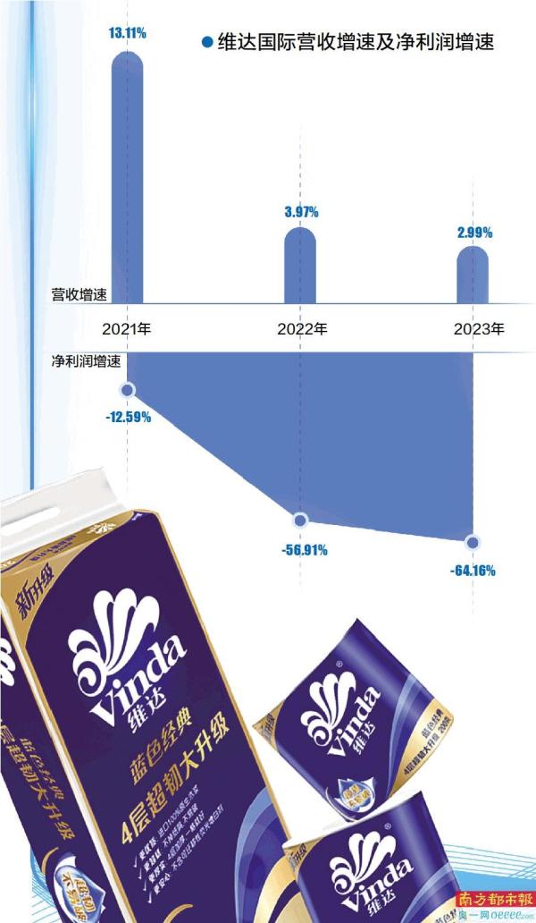 近日,维达国际(03331.HK)发布了2023年财报。财报显示,2023年维达国际的营收为199.99亿港元,同比增长了2.99%;净利润为2.53亿港元,同比下跌64.16%。这也是维达国际连续三年净利润下跌,并且下跌幅度进一步扩大。