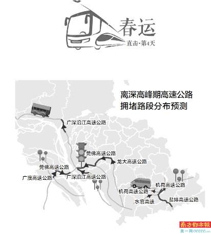 春运首周就将迎来离深车流高峰。深圳市交通运输局运行中心根据海量交通大数据和往年监测数据判断,即日起至1月16日(春运第一周)前后为离深高峰期,2月7日-2月13日(节后第二周)前后为返深高峰期,这两周深圳市区及深圳周边高速公路的运行速度将为春运期间的最低水平,预计局部道路交通将出现拥堵。