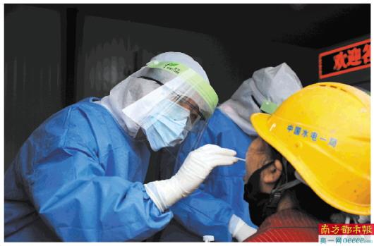 →即日起,从武汉返回深圳的人员要求做两次核酸检测。图为2020年3月12日,深圳宝安近百名返深的工人正在接受核酸检测。