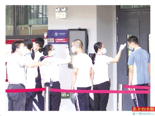 考生们携带考试物品经过体温检测,有序进入考场。