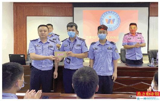 会上,流塘派出所副所长尹忠明宣读了表彰决定,向近日成功阻止一宗冒充公检法诈骗案件的网格员曾健聪、蓝马甲队员陈伟浩进行表彰奖励。尹忠明副所长对流塘网格巡查中队在反诈骗专项行动开展以来所付出的努力及取得的成绩予以充分肯定,要求网格员进一步增强社会责任意识,与警区联勤联动,继续加强辖区群众反诈骗宣传教育工作,不断提升辖区群众防骗识骗意识和能力,为维护社区治安稳定做出新的贡献。