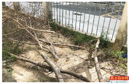 海映山庄掉落树枝堆积在小区角落。