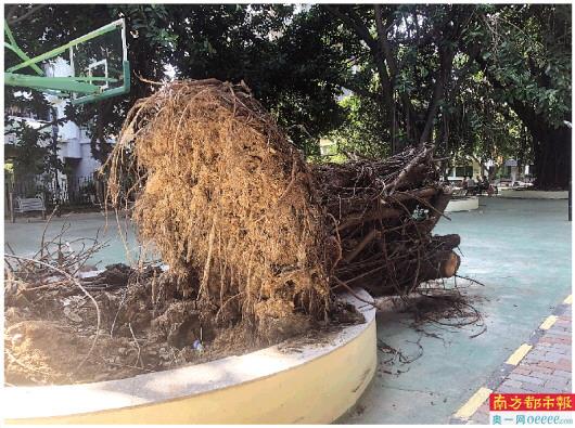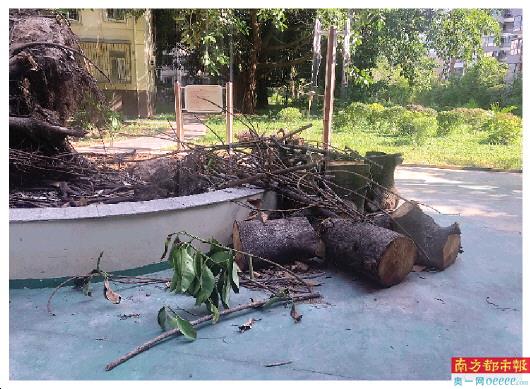 在该小区的健身活动区域,记者看到了徐女士所说的被连根吹倒的大树,大树的枝干部分已经连根而起,枝干横放在健身区域中。居民陈女士告诉记者,几个月前,自己就是在这个健身区域被枝干砸到了脑袋。陈女士回忆,小区每次下完雨,枯枝败叶都比较多地往下掉,“那天我就带小朋友在那里玩,一根枝干掉下来就砸到了我的脑袋上”,所幸陈女士并无大碍,只是头肿了,恢复了几天也就好了。但一直以来,陈女士对小区的绿化修剪都不甚满意,“基本没看小区里有做过树木修剪,每次下过雨后小区就和原始森林一样脏,而且好多树都是已经烂掉坏掉的了,树里都有白蚁”。想到即将到来的台风季,陈女士更是担心这些大树可能带来的安全隐患。