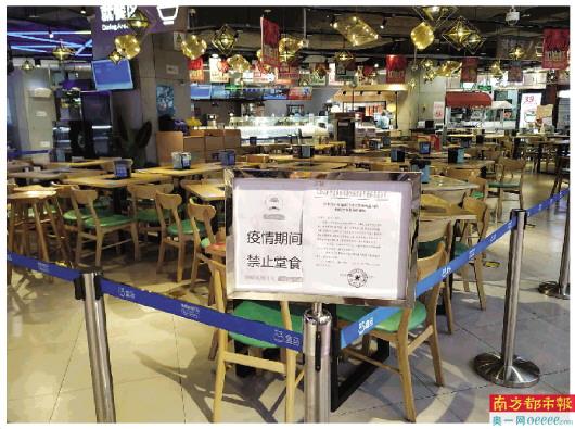 和人来人往的卖场不同,盒马水贝店堂食区仍处于暂停营业的状态。记者走访发现,该区域已用隔离带围起来,在卖场走往就餐桌的方向显眼处,竖着一块告示牌,上面写有“疫情期间,禁止堂食”。