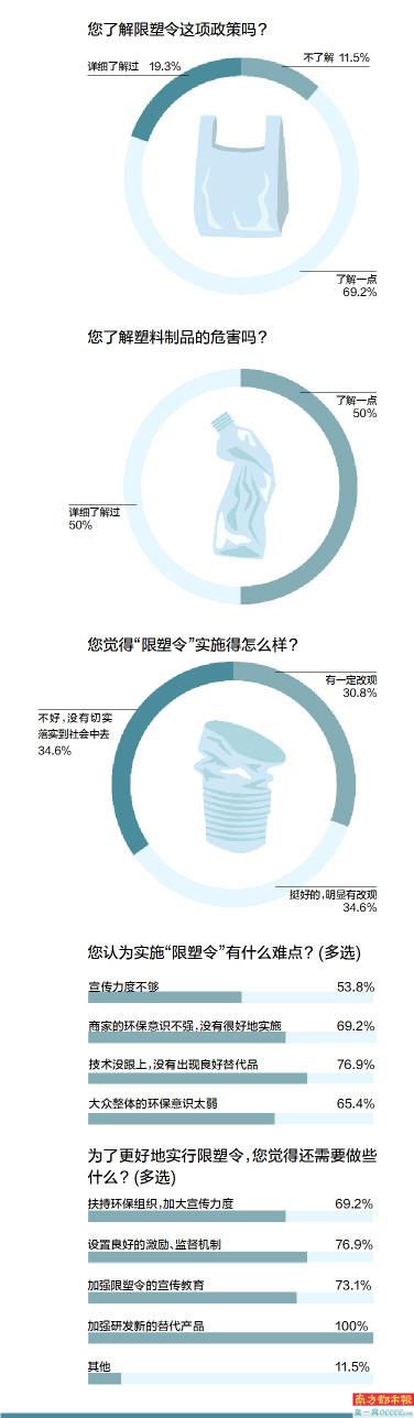 围绕“限塑令”的相关问题,南都记者在近日发起热点站站队调查。数据显示,对于是否了解塑料制品危害问题,表示了解一点和详细了解过的网友各占一半,均为50%。面对新版“限塑令”的落实情况,有30.8%的网友表示使用塑料情况得到一定改观,34.6%的网友表示明显有改观,34.6%的网友则表示“限塑令”并没有切实落实到社会中。