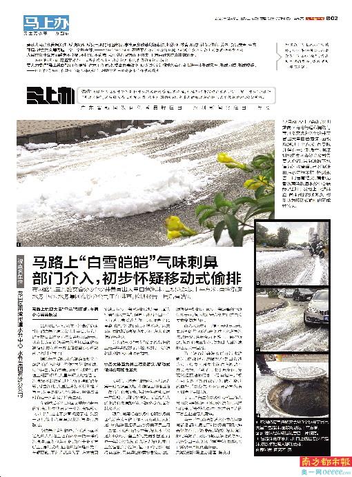 12月8日早上7点许,龙岗区南湾街道布澜路与宝丹路交会处3个污水井盖冒出大量白色泡沫,形如皑皑白雪,面积均超过十平方米,现场能嗅到臭味。随后,南湾街道水务中心和水务集团布沙分公司的工作人员来到现场处置。工作人员对现场周边进行大排查,并对污水进行取样。据附近市民反映,直至下午2时,泡沫才褪去。