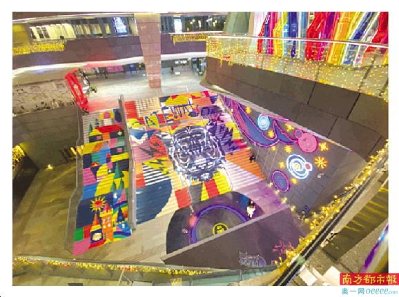 但测评团到达现场时并未感受到这种山海结合的艺术元素,反倒是经过这几年的调整定位,一期的整体风格更偏向于亲子。大面积彩绘的楼梯引人注目,现场了解到每周末下沉广场都会有音乐汇演,但现场灯光较暗,一侧的灯光也不知何故未开。